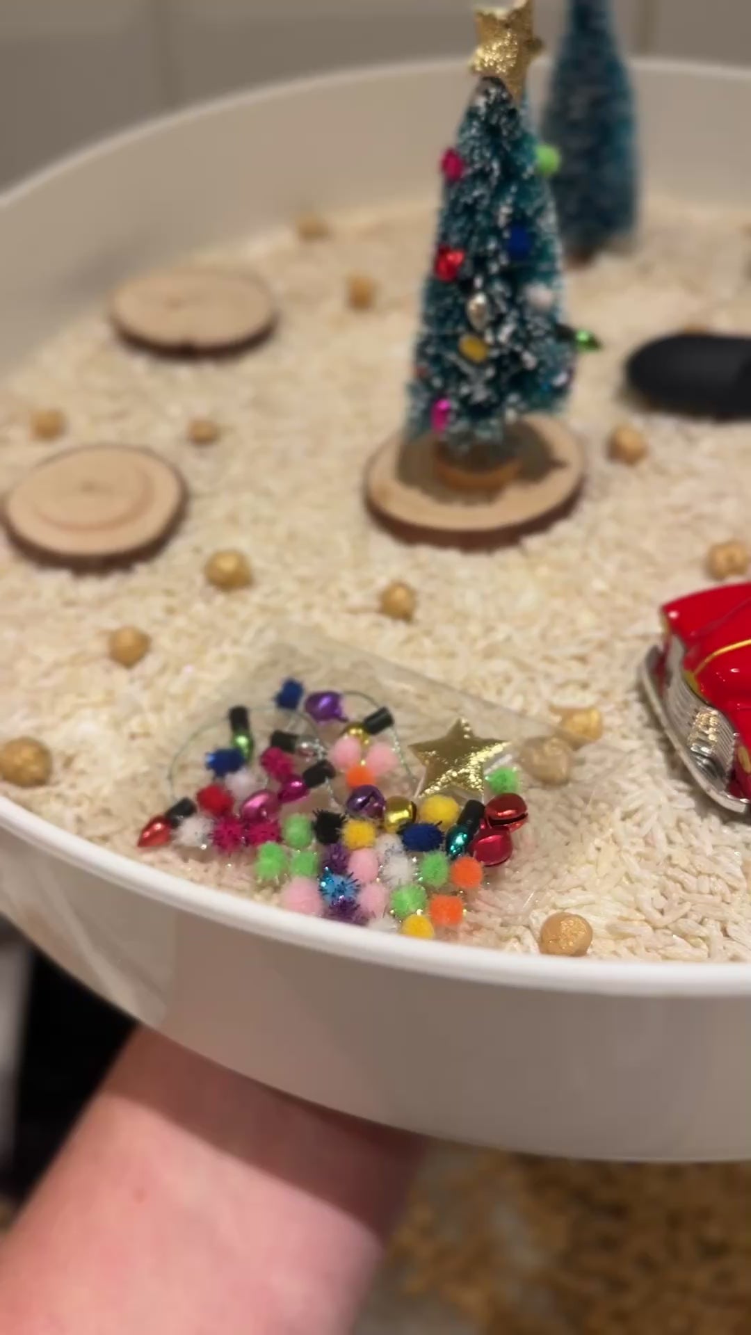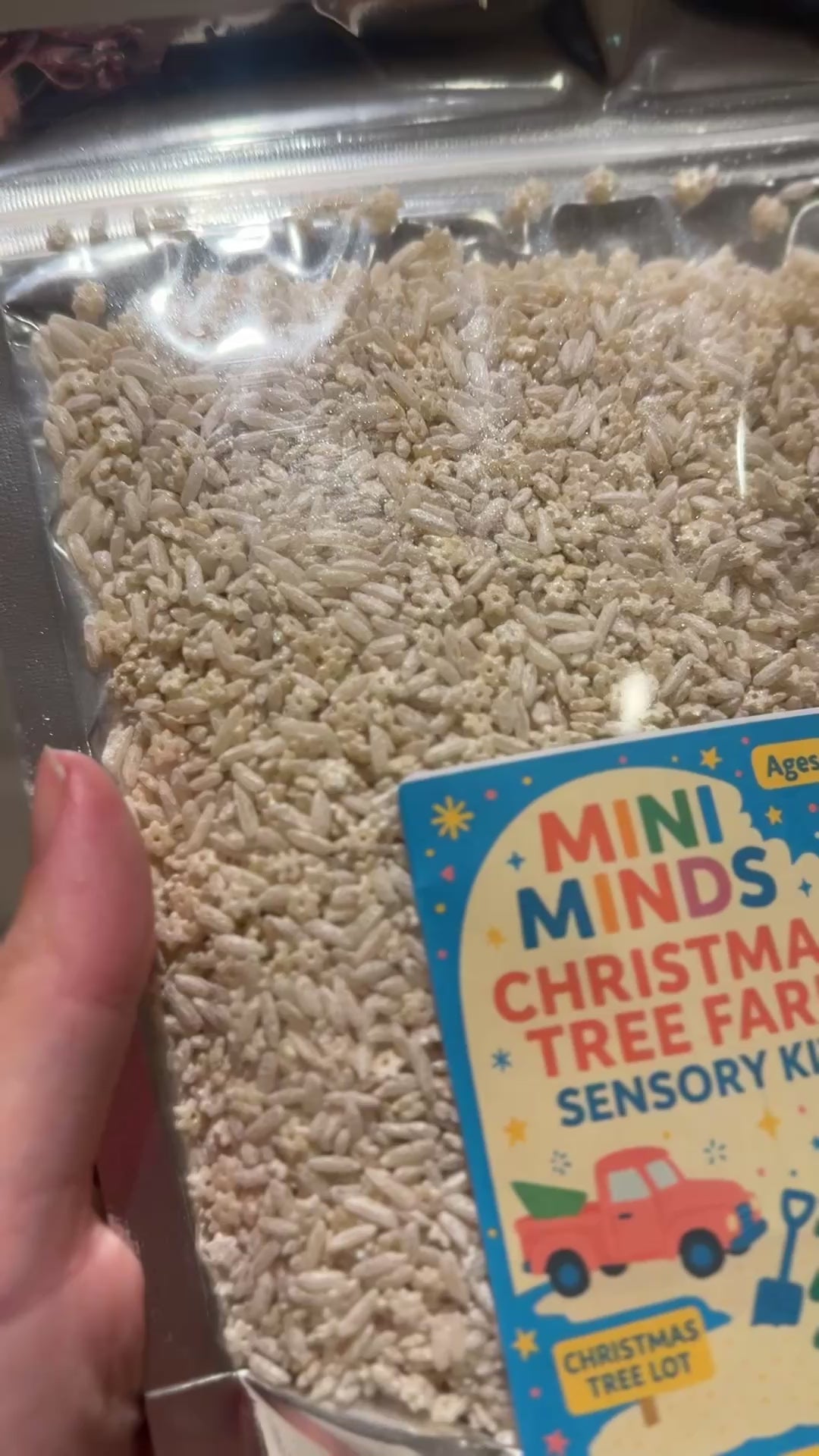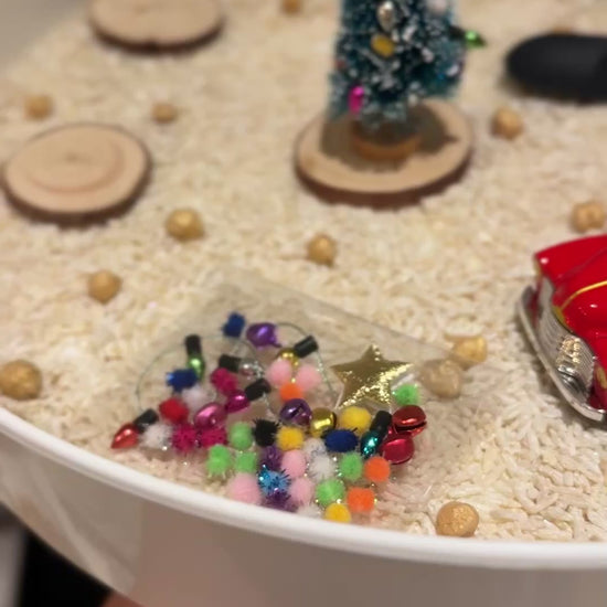The base of the kit is soft white “snow” rice with a gentle sparkle — perfect for scooping, pouring, and imaginative small-world play. It’s a cosy festive scene that encourages creativity, storytelling and fine motor skills — all while bringing a sprinkle of Christmas magic to playtime.