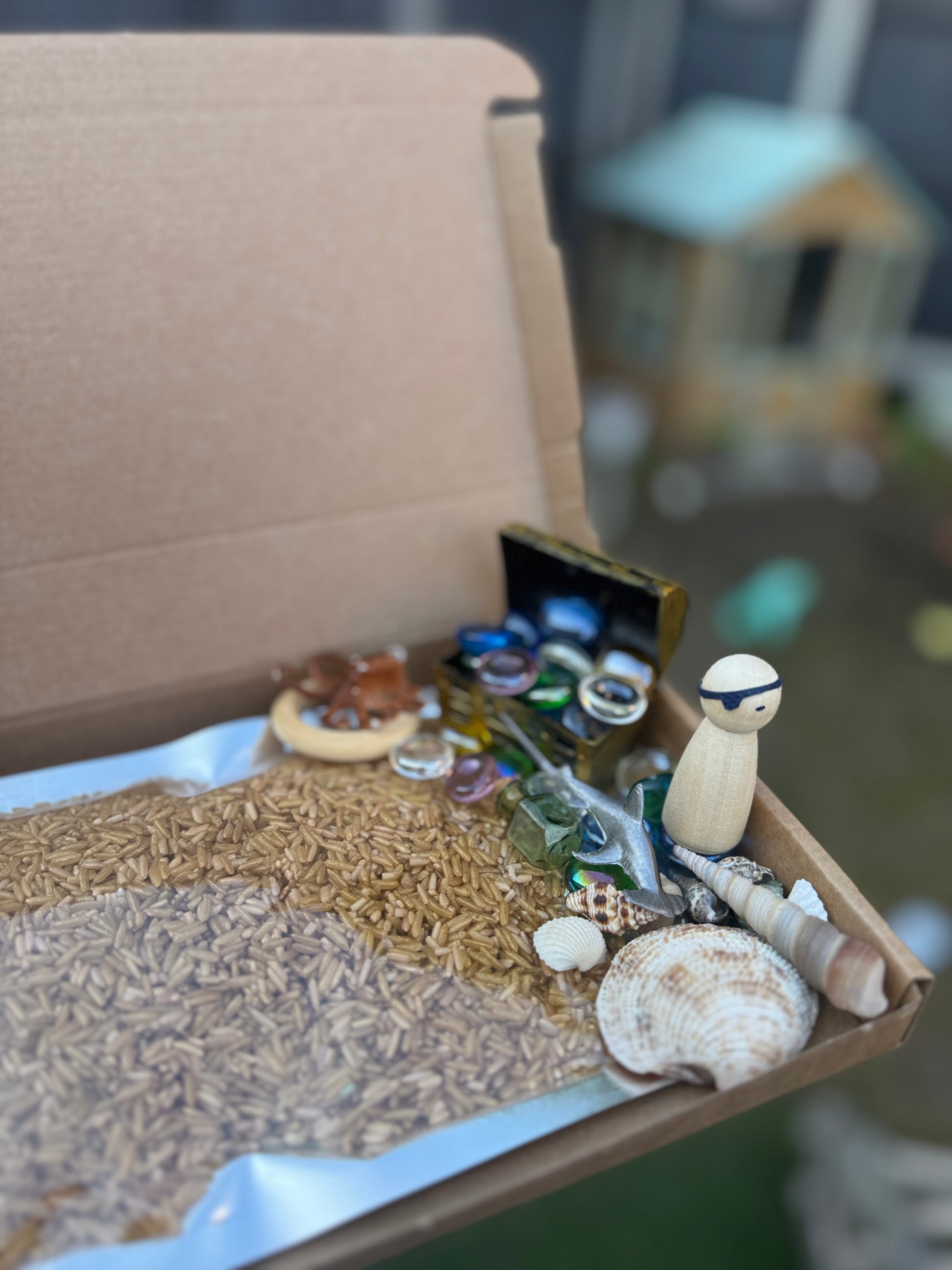 Set sail on a golden adventure! This pirate-themed sensory kit invites little treasure hunters to dig, hide, and discover their own buried wonders. With shimmering golden rice, seashells, a peg pirate, and hidden treasures to unearth, it’s the perfect way to spark imaginative play while building fine motor skills.